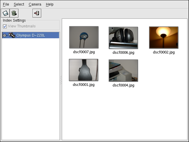 Directories shown below the icon may differ depending on your brand of camera. Select the directory that commonly stores your images and the stored images will immediately load as thumbnail images in the main panel. From this panel, click on the images you want, which you can then save to disk by choosing File => Save Selected Photos. If you want to save all of the stored images, choose Select => All, then save the images to disk.